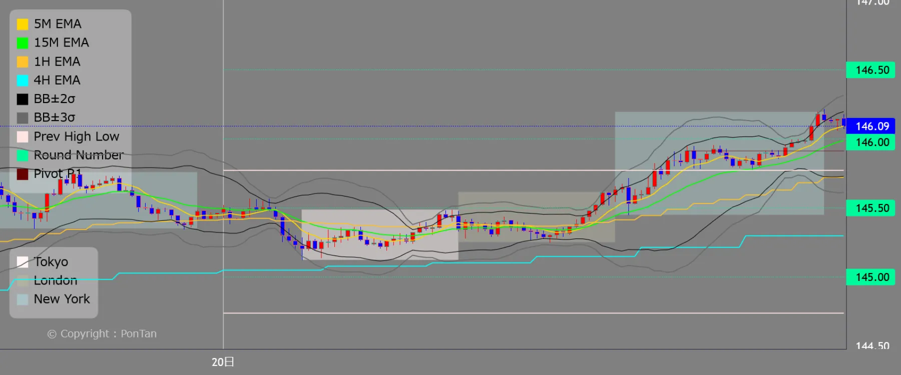 يوضح الرسم البياني PonTan تحركات الأسعار على مدار خمسة أيام، بما في ذلك اليوم المسجل في السجل. يتم عرض الرسم البياني لمدة 15 دقيقة فقط. يمكن استخدام عجلة الفأرة للتكبير والتصغير، ويسمح لك التمرير لليمين واليسار بالرجوع إلى الوراء والتحقق من تحركات الأسعار السابقة. يشير الخط العمودي إلى خط التاريخ ويكون مرئيًا دائمًا، ولكن قد يتم حذف التاريخ الموجود في الأسفل اعتمادًا على عامل التكبير. يتم تحديث الرسوم البيانية ليوم السجل تلقائياً كل 15 دقيقة. عندما يتغير التاريخ، لا يخضع للتحديثات اللاحقة سوى الرسم البياني المطابق لسجل ذلك اليوم، بينما تكون الرسوم البيانية للتواريخ الأخرى ثابتة. يهدف هذا إلى "الاحتفاظ بسجل للمخططات التي كنت تنظر إليها في الوقت الفعلي في ذلك اليوم".